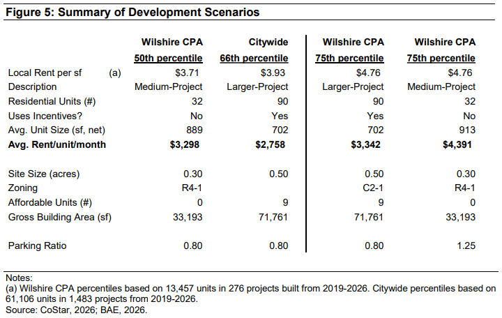 The most salient fact is that they evaluate just two multifamily building types (32 units and 90 units) in one community plan area (of the city's 34). The building characteristics are described in Figure 5 below. From the analysis of these two buildings in one neighborhood, United to House LA is able to say that a 15-year exemption “would make very few projects feasible.” (This is less important, but for some reason, the smaller building doesn't use density bonus incentives — nearly unheard of in today's development environment.)