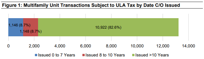 I think its purpose is to suggest that Measure ULA is no big deal because over 80% of units in ULA-eligible multifamily transactions are in projects over 10 years old. If so, it's the wrong chart for that claim. LA's housing stock grows by around 1.5% per year or less, so of course most sales are going to be of older multifamily — the vast majority of the stock is over 10 years old.